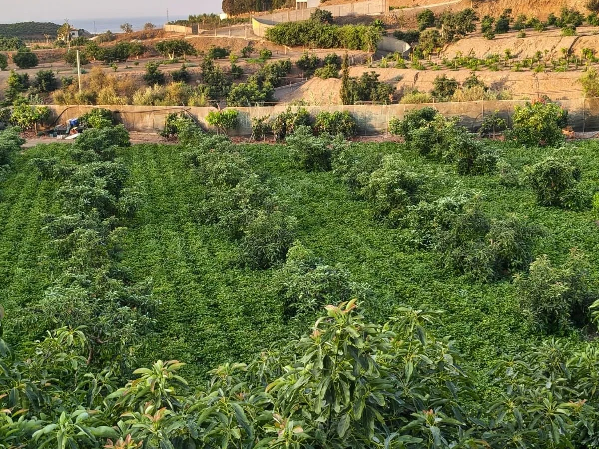 Allereerst bedekt hij zijn bodem al-tijd, om die te beschermen voor de genadeloze Andalusische zon. Dit doet hij met de resten van planten (bladeren, wortels, ...) die hij op de grond laat liggen zodat ze vergaan tot organisch materiaal, ofwel met andere gewassen zoals de zoete aardappel die we de vorige weken verkochten die tussen de mango's stond, of met bodembedekkers: kruiden, struiken, peulvruchten, ... die goed zijn voor de bodem en jaar na jaar roteren.